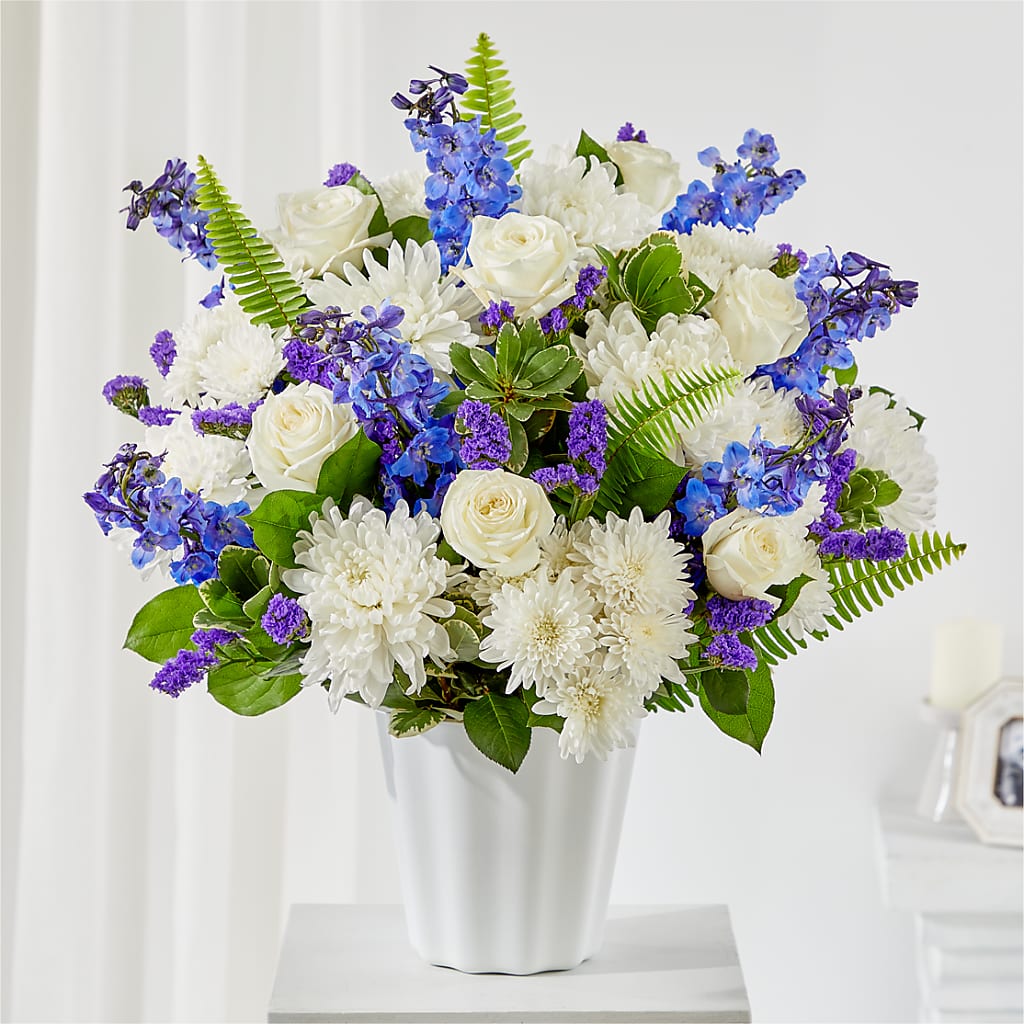 Un panier adapté à une table ou au sol, rempli de fleurs blanches et bleues tranquilles, est une belle façon de partager vos condoléances pendant un service.